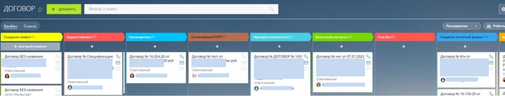 На стадии "Корректировка" стоит автоматизация, согласно которой запускается процесс внесения корректировок с последующим согласованием данных корректировок, что упрощает процесс передачи задач между ответственными лицами и минимизирует риск допущения человеческой ошибки. Также, к каждому договору формируется лист согласования.